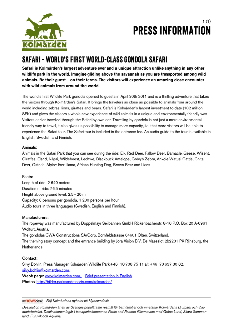 Safari is Kolmården’s largest adventure ever and a unique attraction unlike anything in any other wildlife park in the world. Imagine gliding above the savannah as you are transported among wild animals. Be their guest – on their terms. The visitors will experience an amazing close encounter with wild animals from around the world.