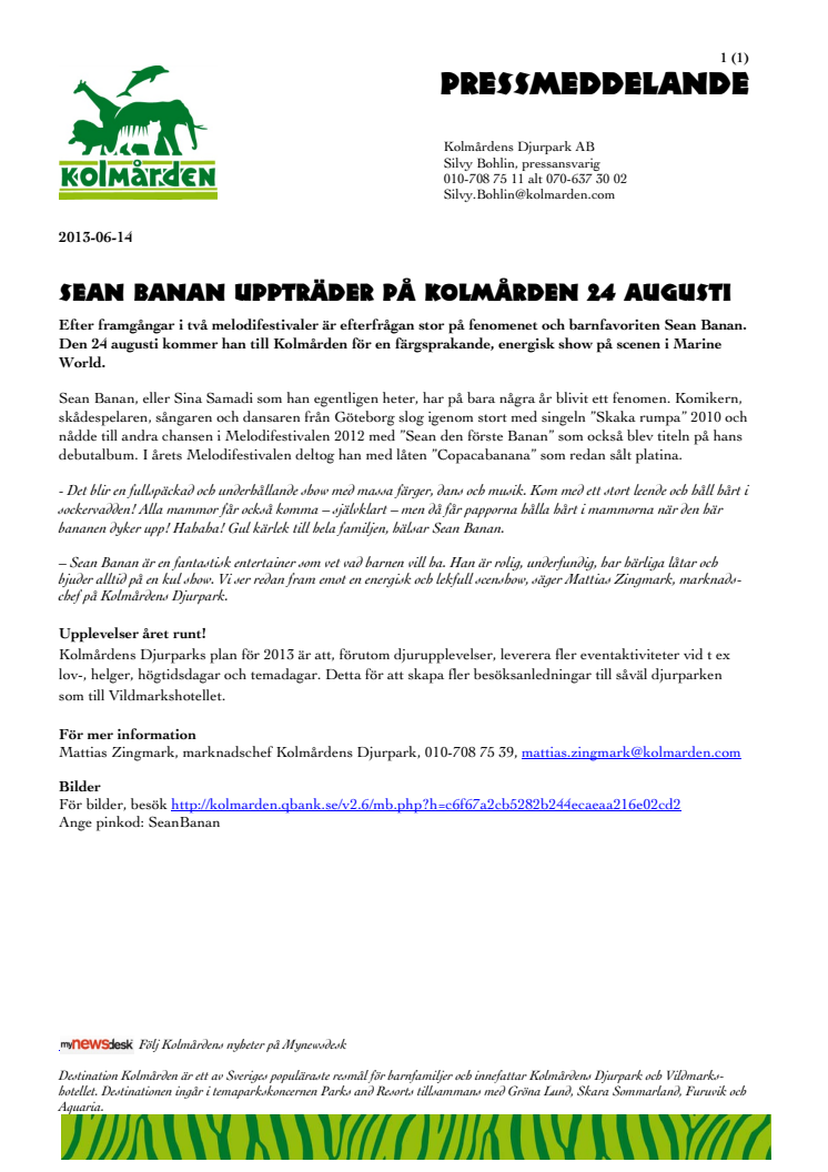 Efter framgångar i två melodifestivaler är efterfrågan stor på fenomenet och barnfavoriten Sean Banan. Den 24 augusti kommer han till Kolmården för en färgsprakande, energisk show på scenen i Marine World.