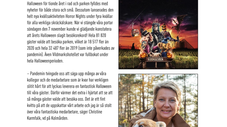 – Pandemin tvingade oss att säga upp många av våra kollegor och de medarbetare som är kvar har verkligen slitit hårt för att lyckas leverera en fantastisk Halloween till våra gäster. Därför värmer det extra i hjärtat att se att så många gäster valde att besöka oss. Det är ett fint kvitto på att de uppskattar vårt arbete och jag är så stolt över våra fantastiska medarbetare, säger Christine Karmfalk, vd på Kolmården.