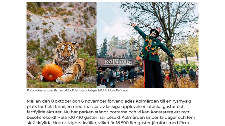 Mellan den 8 oktober och 6 november förvandlades Kolmården till en rysmysig plats för hela familjen med massor av läskiga upplevelser, otäcka gastar och fartfyllda åkturer. Nu har parken stängt portarna och vi kan konstatera ett nytt besöksrekord! Hela 100 410 gäster har besökt Kolmården under 15 dagar och fem skräckfyllda Horror Nights-kvällar, vilket är 18 590 fler gäster jämfört med förra året.