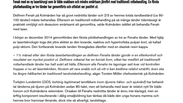 – 1½ månad efter den första laserbehandlingen av delfinen Fenahs tänder gjorde vi en efterkontroll och resultatet ser mycket positivt ut. Delfiners rotkanal har en konisk form, vilket har medfört att traditionellt rotbehandlade tänder har haft svårt att hålla. Eftersom alla Fenahs tre lagningar satt kvar vid kontrollen hoppas vi nu att lasertekniken, förutom att vara snabb och så vitt vi kan bedöma relativt smärtfri, även ska ha längre hållbarhet än traditionell tandrotsbehandling, säger Torsten Möller chefsveterinär på Kolmården.