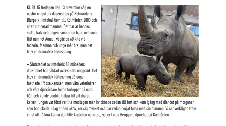 Kl. 01.15 fredagen den 13 november såg en noshörningskalv dagens ljus på Kolmårdens Djurpark. Imfolozi kom till Kolmården 2003 och är en rutinerad mamma. Det här är hennes sjätte kalv och ungen, som är en hane och som fått namnet Amadi, vägde ca 60 kilo vid födseln. Mamma och unge mår bra, men det blev en dramatisk förlossning.