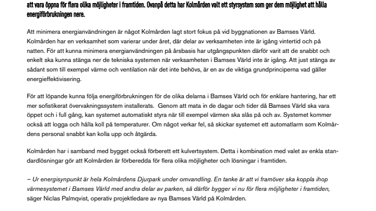Att minimera energianvändningen är något Kolmården lagt stort fokus på vid byggnationen av Bamses Värld. Kolmården har en verksamhet som varierar under året, där delar av verksamheten inte är igång vintertid och på natten. För att kunna minimera energianvändningen på årsbasis har utgångspunkten därför varit att de snabbt och enkelt ska kunna stänga ner de tekniska systemen när verksamheten i Bamses Värld inte är igång. Att just stänga av sådant som till exempel värme och ventilation när det inte behövs, är en av de viktiga grundprinciperna vad gäller energieffektivisering.