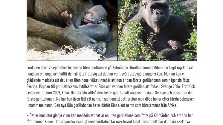 Lördagen den 12 september föddes en liten gorillaunge på Kolmården. Gorillamamman Kiburi har tagit mycket väl hand om sin unge och hållit den så tätt intill sig att det har varit svårt att avgöra ungens kön. Men nu kan vi glädjande meddela att det är en liten hona, vilket innebär att hon är den första gorillahonan som någonsin fötts i Sverige. Pappan till gorillaflockens nytillskott är Enzo och var den första gorillan att födas i Sverige 2006. Enzo fick sedan en lillebror 2009, Echo. Det här blir alltså den tredje gorillan att någonsin födas i Sverige och dessutom den första gorillahonan. Nu har hon även fått ett namn. Traditionellt sett brukar man döpa honor efter första bokstaven i mammans namn. Den nya lilla gorillahonan heter därför Kione, ett namn som härstammar från Afrika.