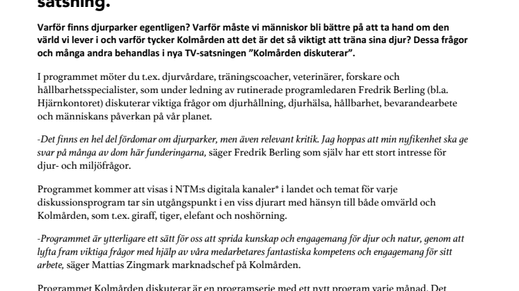 Varför finns djurparker egentligen? Varför måste vi människor bli bättre på att ta hand om den värld vi lever i och varför tycker Kolmården att det är det så viktigt att träna sina djur? Dessa frågor och många andra behandlas i nya TV-satsningen ”Kolmården diskuterar”.