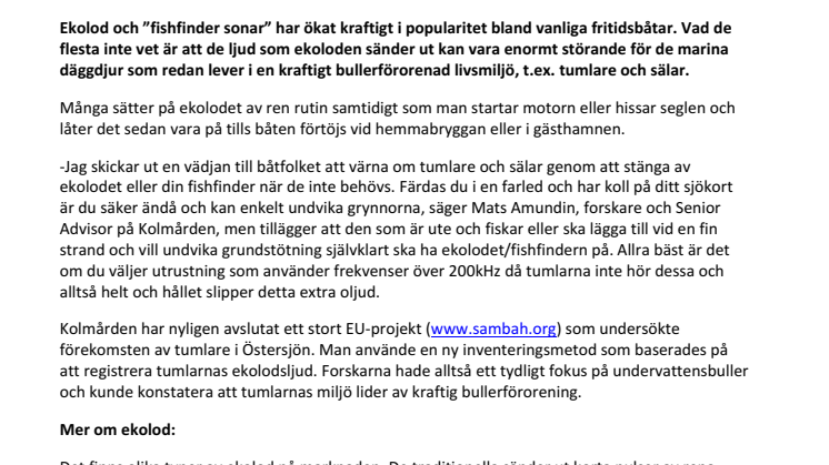 -Jag skickar ut en vädjan till båtfolket att värna om tumlare och sälar genom att stänga av ekolodet eller din fishfinder när de inte behövs. Färdas du i en farled och har koll på ditt sjökort är du säker ändå och kan enkelt undvika grynnorna, säger Mats Amundin, forskare och Senior Advisor på Kolmården, men tillägger att den som är ute och fiskar eller ska lägga till vid en fin strand och vill undvika grundstötning självklart ska ha ekolodet/fishfindern på. Allra bäst är det om du väljer utrustning som använder frekvenser över 200kHz då tumlarna inte hör dessa och alltså helt och hållet slipper detta extra oljud.