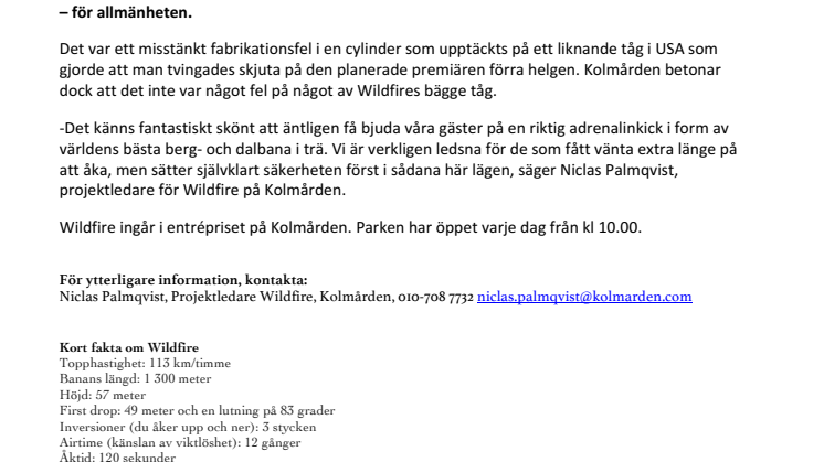 -Det känns fantastiskt skönt att äntligen få bjuda våra gäster på en riktig adrenalinkick i form av världens bästa berg- och dalbana i trä. Vi är verkligen ledsna för de som fått vänta extra länge på att åka, men sätter självklart säkerheten först i sådana här lägen, säger Niclas Palmqvist, projektledare för Wildfire på Kolmården.