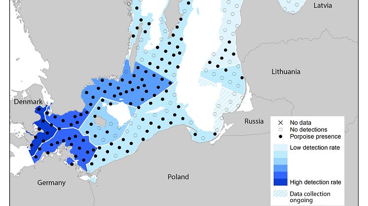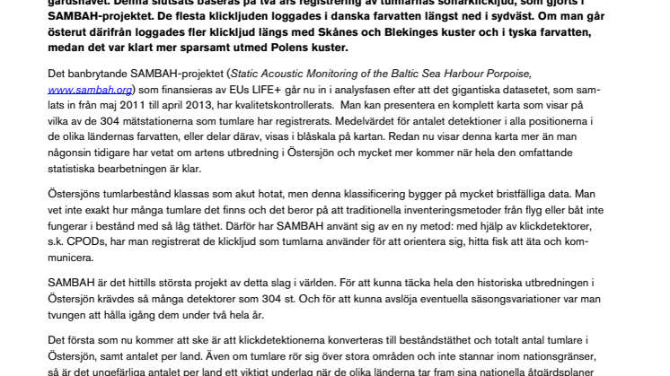Det banbrytande SAMBAH-projektet (Static Acoustic Monitoring of the Baltic Sea Harbour Porpoise, www.sambah.org) som finansieras av EUs LIFE+ går nu in i analysfasen efter att det gigantiska datasetet, som samlats in från maj 2011 till april 2013, har kvalitetskontrollerats. Man kan presentera en komplett karta som visar på vilka av de 304 mätstationerna som tumlare har registrerats. Medelvärdet för antalet detektioner i alla positionerna i de olika ländernas farvatten, eller delar därav, visas i blåskala på kartan. Redan nu visar denna karta mer än man någonsin tidigare har vetat om artens utbredning i Östersjön och mycket mer kommer när hela den omfattande statistiska bearbetningen är klar.