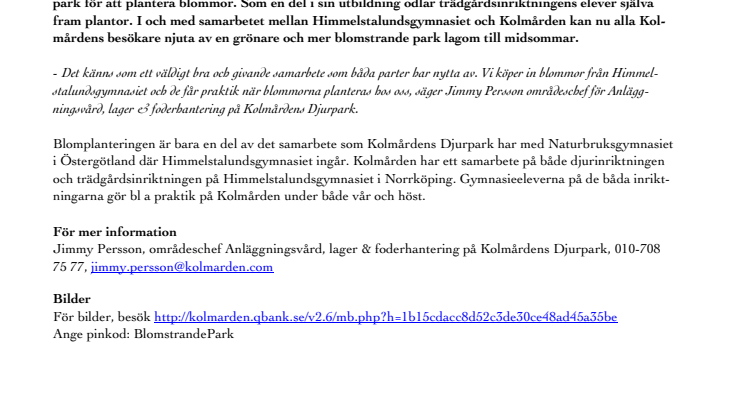 Nu i juni har ett 40-tal elever från Himmelstalundsgymnasiet i Norrköping varit på Kolmårdens Djurpark för att plantera blommor. Som en del i sin utbildning odlar trädgårdsinriktningens elever själva fram plantor. I och med samarbetet mellan Himmelstalundsgymnasiet och Kolmården kan nu alla Kolmårdens besökare njuta av en grönare och mer blomstrande park lagom till midsommar.