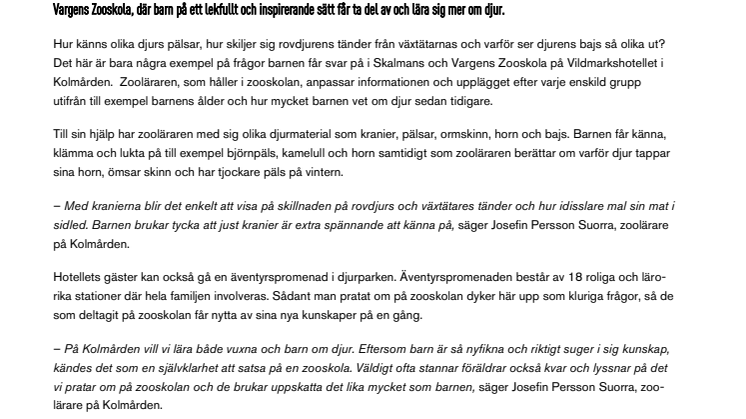 Hur känns olika djurs pälsar, hur skiljer sig rovdjurens tänder från växtätarnas och varför ser djurens bajs så olika ut? Det här är bara några exempel på frågor barnen får svar på i Skalmans och Vargens Zooskola på Vildmarkshotellet i Kolmården. Zooläraren, som håller i zooskolan, anpassar informationen och upplägget efter varje enskild grupp utifrån till exempel barnens ålder och hur mycket barnen vet om djur sedan tidigare.