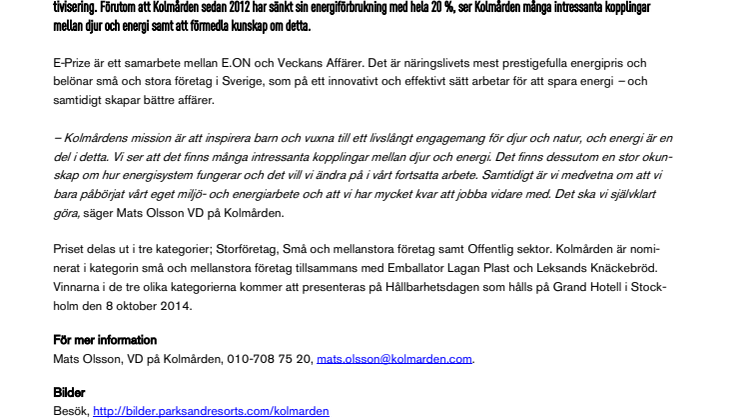 Kolmården är nominerat till E-Prize, ett pris som E.ON och Veckans Affärer ger ut till företag i Sverige som aktivt arbetar med energieffektivisering. Förutom att Kolmården sedan 2012 har sänkt sin energiförbrukning med hela 20 %, ser Kolmården många intressanta kopplingar mellan djur och energi samt att förmedla kunskap om detta.
