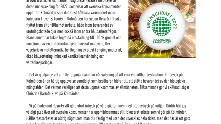 Sustainable Brand Index är Nordens största varumärkesstudie som mäter konsumenters uppfattning om hur hållbara olika varumärken är över branscher och länder. Idag presenterades resultatet av deras undersökning för 2022, som visar att svenska konsumenter uppfattar Kolmården som det mest hållbara varumärket inom kategorin Travel & Tourism. Kolmården har sedan flera år tillbaka flyttat fram sitt hållbarhetsarbete, både inom bevarandet av urotningshotade djur men också inom andra hållbarhetsfrågor. Bland annat har fokus legat på omställning till 100 % grön el och minskning av energiförbrukningen, minskat matsvinn, fler vegetariska matalternativ, borttagning av plast i engångsmaterial, ökad källsortering, minskad kemikalieanvändning och vattenbesparingar.