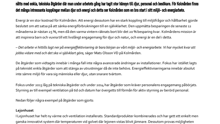 Energi är en stor kostnad för Kolmården. Att energi dessutom har en stark koppling till miljöfrågor och hållbarhet gjorde beslutet om att satsa på att sänka energiförbrukningen till en självklarhet. Den uppmätta besparingen de senaste 12 månaderna är nästan 25 %, men då den varma vintern räknats bort blir det 20 % besparing kvar. Kolmårdens mission är att inspirera barn och vuxna till ett livslångt engagemang för djur och natur, och energi är en del i detta.