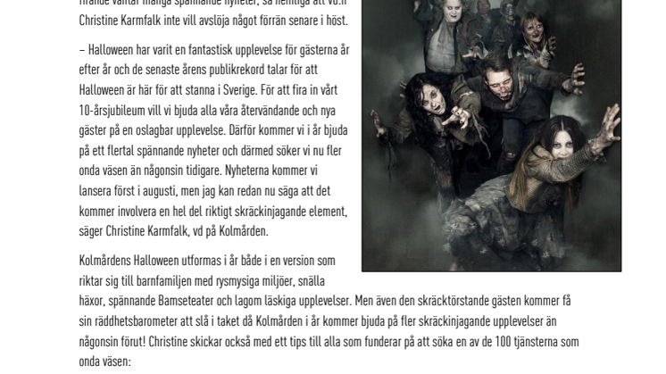 – Halloween har varit en fantastisk upplevelse för gästerna år efter år och de senaste årens publikrekord talar för att Halloween är här för att stanna i Sverige. För att fira in vårt 10-årsjubileum vill vi bjuda alla våra återvändande och nya gäster på en oslagbar upplevelse. Därför kommer vi i år bjuda på ett flertal spännande nyheter och därmed söker vi nu fler onda väsen än någonsin tidigare. Nyheterna kommer vi lansera först i augusti, men jag kan redan nu säga att det kommer involvera en hel del riktigt skräckinjagande element, säger Christine Karmfalk, vd på Kolmården.