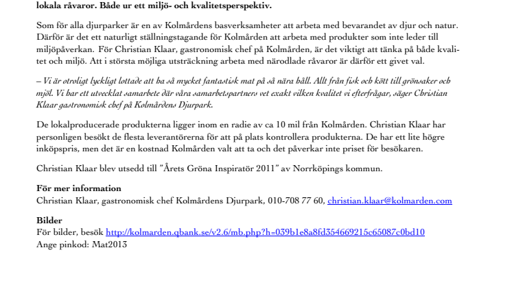 Christian Klaar, gastronomisk chef Kolmårdens Djurpark, 010-708 77 60, christian.klaar@kolmarden.com