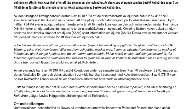 På uppdrag av Parks and Resorts har Novus genomfört en riksomfattande undersökning för att kartlägga svenskarnas intresse för djur och natur samt deras inställning till djurparkernas syfte. 1 090 svenskar deltog i undersökningen och av resultatet kan man utläsa att det finns en allmän kunskapstörst efter att lära sig mer om djur och natur. Av den grupp svarande som har besökt Kolmården anger 7 av 10 att deras förståelse för djur och natur har ökat i samband med besöket på Kolmården.