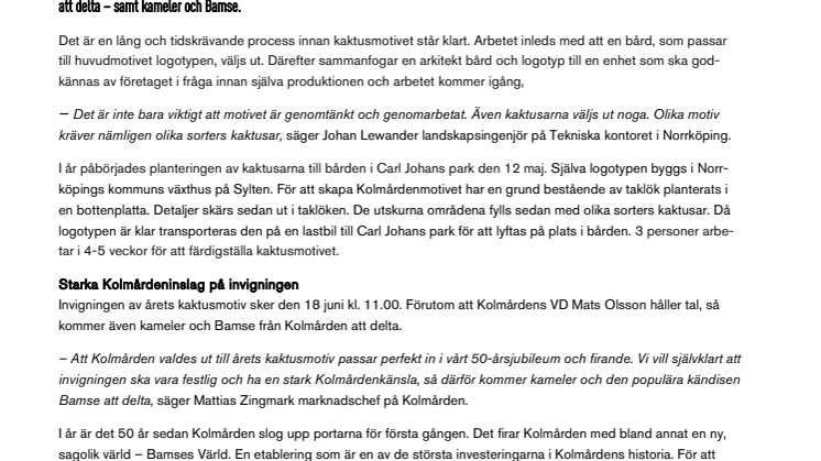 50-årsjubilerande Kolmårdens Djurpark står som motiv i årets kaktusplantering i Carl Johans park i Norrköping. Under maj till juni har det varit full aktivitet med att plantera de tusentals växter som bildar motivet. På invigningen den 18 juni kommer Kolmårdens VD Mats Olsson att delta – samt kameler och Bamse.