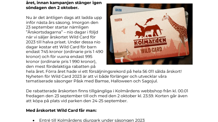 Nu är det äntligen dags att ladda upp inför nästa års säsong. Imorgon den 23 september startar nämligen ”Årskortsdagarna” – nio dagar i följd när vi säljer årskortet "Wild Card" för 2023 till halva priset. Under dessa nio dagar kostar ett Wild Card för barn endast 745 kronor (ordinarie pris 1 490 kronor) och för vuxna endast 995 kronor (ordinarie pris 1 990 kronor), den mest fördelaktiga rabatten på hela året. Förra året hade vi ett försäljningsrekord på hela 56 011 sålda årskort! Nyheten för Wild Card 2023 är att vi både förlänger och utvecklar våra tematiserade säsonger Påsk med Bamse, Halloween och Sagojul.