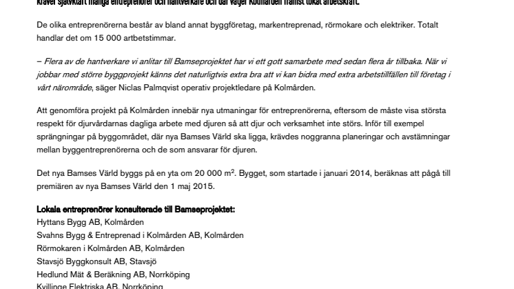 Kolmården är mitt uppe i byggnationen av nya Bamses Värld som ska stå klart till Kolmårdens 50-årsjubileum 2015. Ett så stort bygge kräver självklart många entreprenörer och hantverkare och där väljer Kolmården främst lokal arbetskraft.