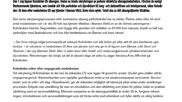 Den 1 maj öppnar Kolmården för säsongen. Redan nu inleds rekryteringen av parkens värdefulla säsongsmedarbetare. Förutom de vanligt återkommande tjänsterna, som innebär allt från parkvärdar och djurvårdare till berg- och dalbaneförare och hotellpersonal, söker Kolmården i år även efter medarbetare till nya tjänster i Bamses Värld, årets stora nyhet. Totalt ska ca 450 säsongstjänster tillsättas.