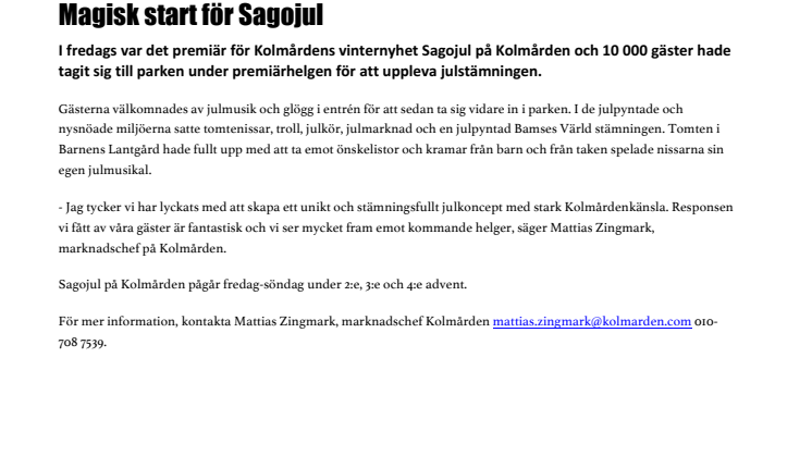 I fredags var det premiär för Kolmårdens vinternyhet Sagojul på Kolmården och 10 000 gäster hade tagit sig till parken under premiärhelgen för att uppleva julstämningen.