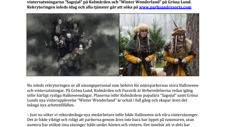 Nu inleds rekryteringen av all säsongspersonal som behövs för nöjesparkernas stora Halloween- och vintersatsningar. På Gröna Lund, Kolmården och Furuvik är förberedelserna redan igång inför härligt rysliga Halloweendagar. Planerna inför Kolmårdens populära ”Sagojul” samt Gröna Lunds nya vinterupplevelse ”Winter Wonderland” är också i full gång och skapar även det många nya arbetstillfällen.