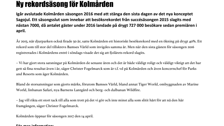 Igår avslutade Kolmården säsongen 2016 med att stänga den sista dagen av det nya konceptet Sagojul. Ett säsongsslut som innebar att besöksrekordet från succésäsongen 2015 slagits med nästan 7000, då antalet gäster under 2016 landade på drygt 727 000 besökare sedan premiären i april.