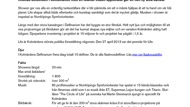 Showen ger oss alla en ordentlig tankeställare där vi blir påminda om att vi måste hjälpas åt att ta hand om vår planet. ”Life” skapar alltså både eftertanke och kunskap samtidigt som det blir mycket glädje. Musiken i showen är inspelad av Norrköpings Symfoniorkester.