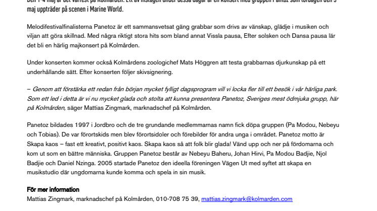 – Genom att förstärka ett redan från början mycket fylligt dagsprogram vill vi locka fler till ett besök i vår härliga park. Som ett led i detta är vi nu mycket glada och stolta att kunna presentera Panetoz, Sveriges mest ödmjuka grupp, här på Kolmården, säger Mattias Zingmark, marknadschef på Kolmården.