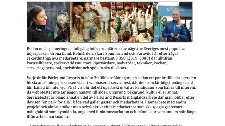 Idag startar den stora årliga rekryteringen till Parks and Resorts nöjesparker Gröna Lund, Kolmården, Skara Sommarland och Furuvik. I år söker man 3350 nya medarbetare, vilket är rekordmånga. Alltifrån berg- och dalbaneförare till sockervaddssnurrare, giraffskötare, kockar, badvakter, tekniker och spelvärdar sökes för att ta hand om parkernas dryga 3 miljoner gäster.