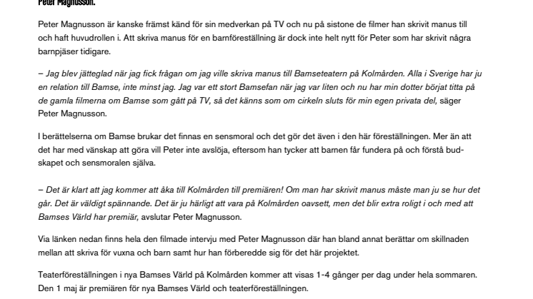 Den 1 maj har Kolmården premiär för nya Bamses Värld där bland annat en teaterföreställning kommer att visas varje dag under sommaren. Manus till teaterföreställningen, där Bamse och några av hans vänner deltar, har skrivits av komikern, skådespelaren och manusförfattaren Peter Magnusson.