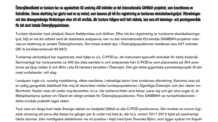 Östersjöbeståndet av tumlare har nu uppskattats till omkring 450 individer av det internationella SAMBAH-projektet, som koordineras av Kolmården. Denna skattning har gjorts med en ny metod, som baseras på två års registrering av tumlarnas ekolokaliseringsljud. Utbredningen och den säsongsmässiga fördelningen visar att ett område, där tumlare tidigare varit helt okända, kan vara ett kalvnings- och parningsområde för det akut hotade Östersjöpopulationen.