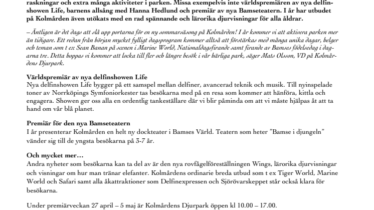 – Äntligen är det dags att slå upp portarna för en ny sommarsäsong på Kolmården! I år kommer vi att aktivera parken mer än tidigare. Ett redan från början mycket fylligt dagsprogram kommer alltså att förstärkas med många unika dagar, helger och teman som t ex Sean Banan på scenen i Marine World, Nationaldagsfirande samt firande av Bamses födelsedag i dagarna tre. Detta hoppas vi kommer att locka till fler och längre besök i vår härliga park, säger Mats Olsson, VD på Kolmårdens Djurpark.
