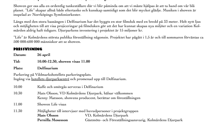 Kolmårdens nya delfinshow ”Life” bygger på ett samspel mellan delfiner, avancerad teknik och musik. Till nyinspelade toner av Norrköpings Symfoniorkester tas besökarna med på en resa som kommer att hänföra, kittla och engagera. På ett underhållande och engagerande sätt förmedlas en historia där delfinernas beteenden i kombination med en teknisk visuell upplevelse ger en helt ny wow-känsla. Showen har premiär den 27 april, men redan den 26 april är media välkomna till en pressvisning av Life.