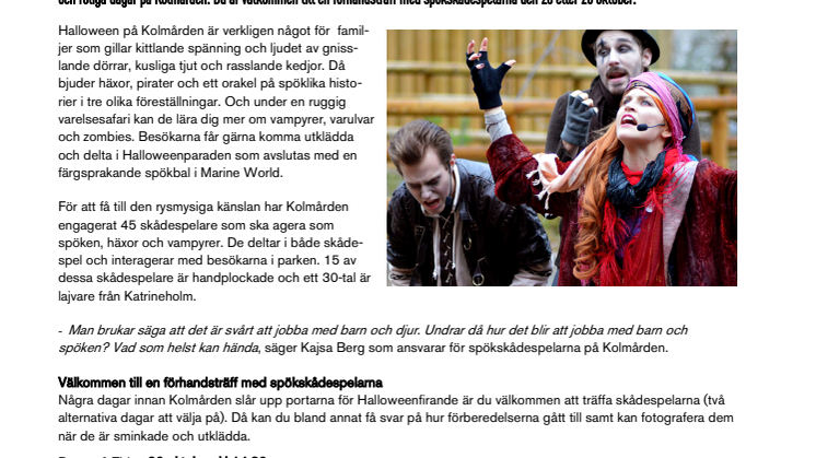 Läskiga gastar, häxor, spöken och vampyrer kryper nu fram ur sina hålor. 30 oktober – 2 november är det återigen dags för några rysliga och roliga dagar på Kolmården. Du är välkommen till en förhandsträff med spökskådespelarna den 26 eller 28 oktober.