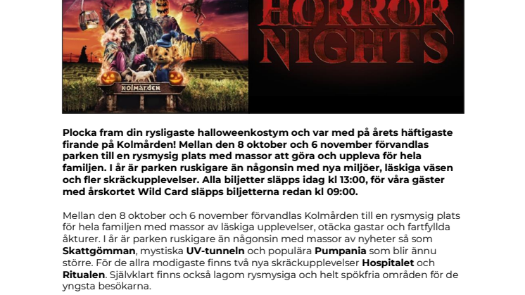 Biljetterna till Halloween på Kolmården och Horror Nights släpps idag kl 13:00, för våra gäster med årskort Wild Card släpps biljetterna redan kl 09:00.