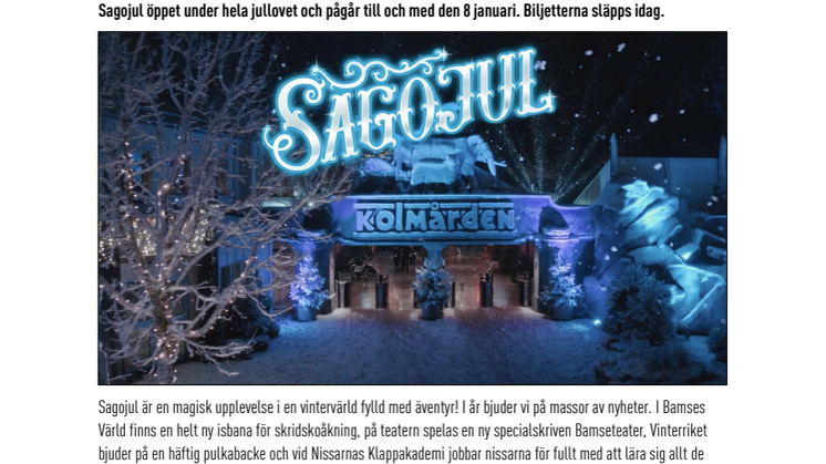 Den 26 november slår vi återigen upp portarna till en gnistrande magisk vintervärld fylld av julkänsla och äventyr – för stora som små. Här får barnen träffa Tomten, besöka trollen i Trollskogen och hälsa på Bamse i hans julpyntade Småköping där det i år finns en helt ny skridskobana. För första gången har Sagojul öppet under hela jullovet och pågår till och med den 8 januari. Biljetterna släpps idag.