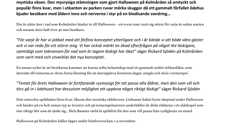 Under höstlovet förvandlas Kolmårdens djurpark återigen till en samlingsplats för traktens alla mystiska väsen. Den mysrysiga stämningen som gjort Halloween på Kolmården så omtyckt och populär finns kvar, men i utkanten av parken ruvar mörka skuggor då ett gammalt förfallet ödehus bjuder besökare med åldern inne och nerverna i styr på en blodisande vandring…