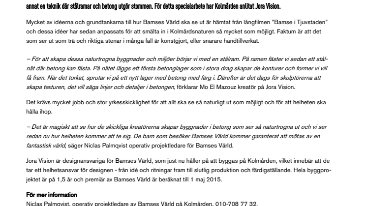– Det är magiskt att se hur de skickliga kreatörerna skapar byggnader i betong som ser så naturtrogna ut och vi ser redan nu hur helheten kommer att te sig. De barn som besöker Bamses Värld kommer garanterat att mötas av en fantastisk värld, säger Niclas Palmqvist operativ projektledare för Bamses Värld.