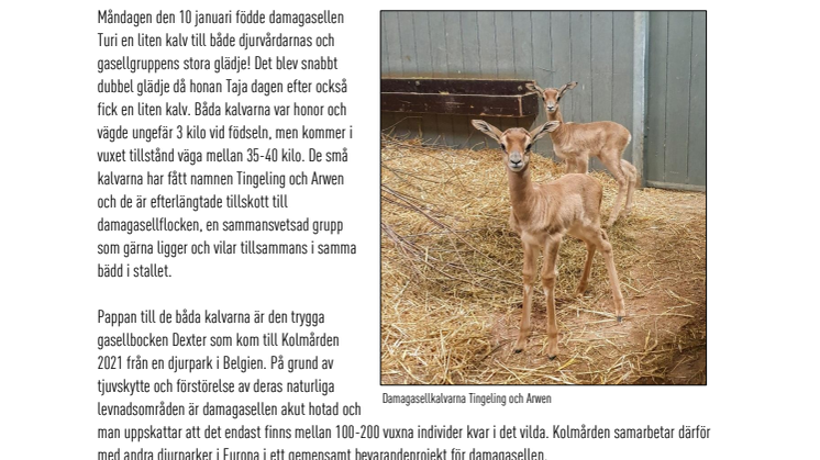 Den 10 och 11 januari föddes de första damagasellkalvarna någonsin i Sverige. Det var honorna Turi och Taja som fick varsin liten kalv med en dags mellanrum. Damagasellen är en akut hotad art med färre än 200 individer kvar i det vilda. Kolmården deltar i ett europeiskt bevarandeprojekt för damagasellen och därför är det extra glädjande att två små nya kalvar nu sett dagens ljus.