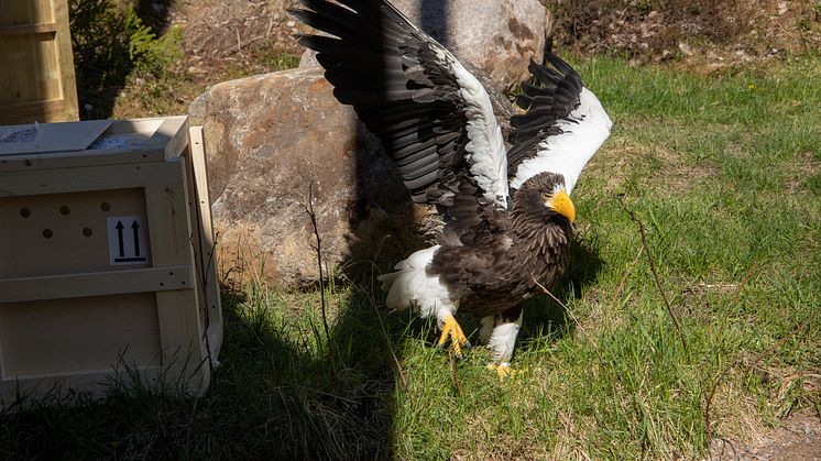 Med ett vingspann på 2,5 meter och en vikt uppemot 10 kg gör jättehavsörnen skäl för sitt namn. I specialbyggda transportlådor och med omfattande tillstånd från såväl ryska som svenska myndigheter kunde de två jättehavsörnarna flyttas från Moskva Zoo till Kolmårdens djurpark under våren. Örnarna överläts från djurparken i Moskva utan kostnad, vilket är praxis för utrotningshotade arter som flyttas inom den europeiska djurparksföreningen. De två örnarna deltar nämligen i ett internationellt bevarandeprogram för att rädda arten.