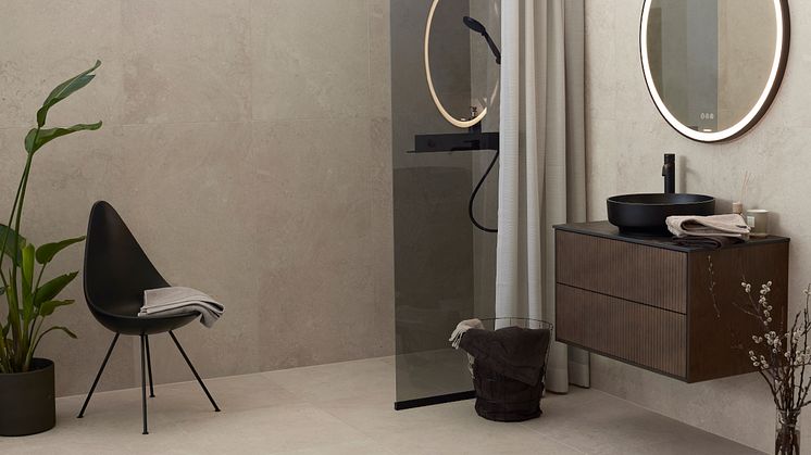 Pedra Azul är en behaglig serie i granitkeramik som är inspirerad av kalksten från Iberiska halvön. Plattorna har ett följsamt mjukt mönster med naturtrogna detaljer. Serien finns i fyra kulörer: Natural (på bilden), Greige, Ivort och Grey.