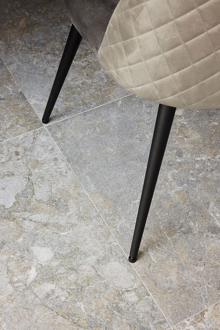 Dinamika Breccia Grey är kraftfull med sin rustika stenmönstrade yta. Den grå ytan skiftar i nyans med mörka och ljusa partier. Den naturliga känslan är påtaglig – här är fläckar inget annat än naturliga skönhetsfläckar som bär på en historia. Dekoren bjuder mjuka former likt årsringar i ett träd.
