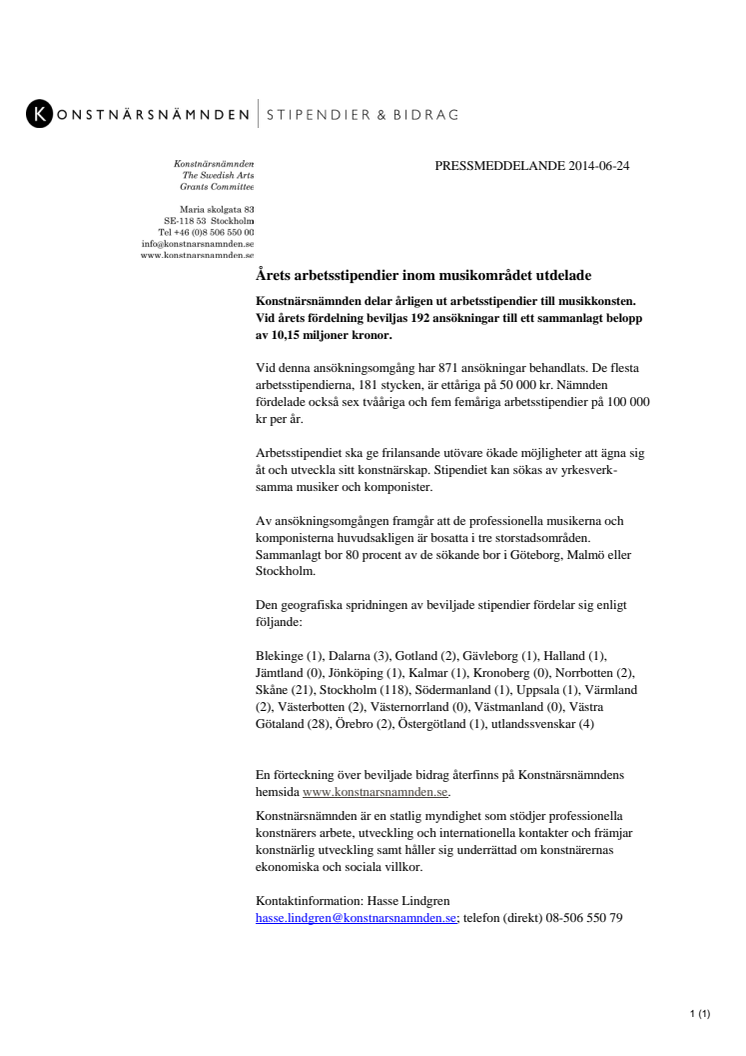 Konstnärsnämnden delar årligen ut arbetsstipendier till musikkonsten. Vid årets fördelning beviljas 192 ansökningar till ett sammanlagt belopp av 10,15 miljoner kronor. Vid denna ansökningsomgång har 871 ansökningar behandlats. De flesta arbetsstipendierna, 181 stycken, är ettåriga på 50 000 kr. Nämnden fördelade också sex tvååriga och fem femåriga arbetsstipendier på 100 000 kr per år.