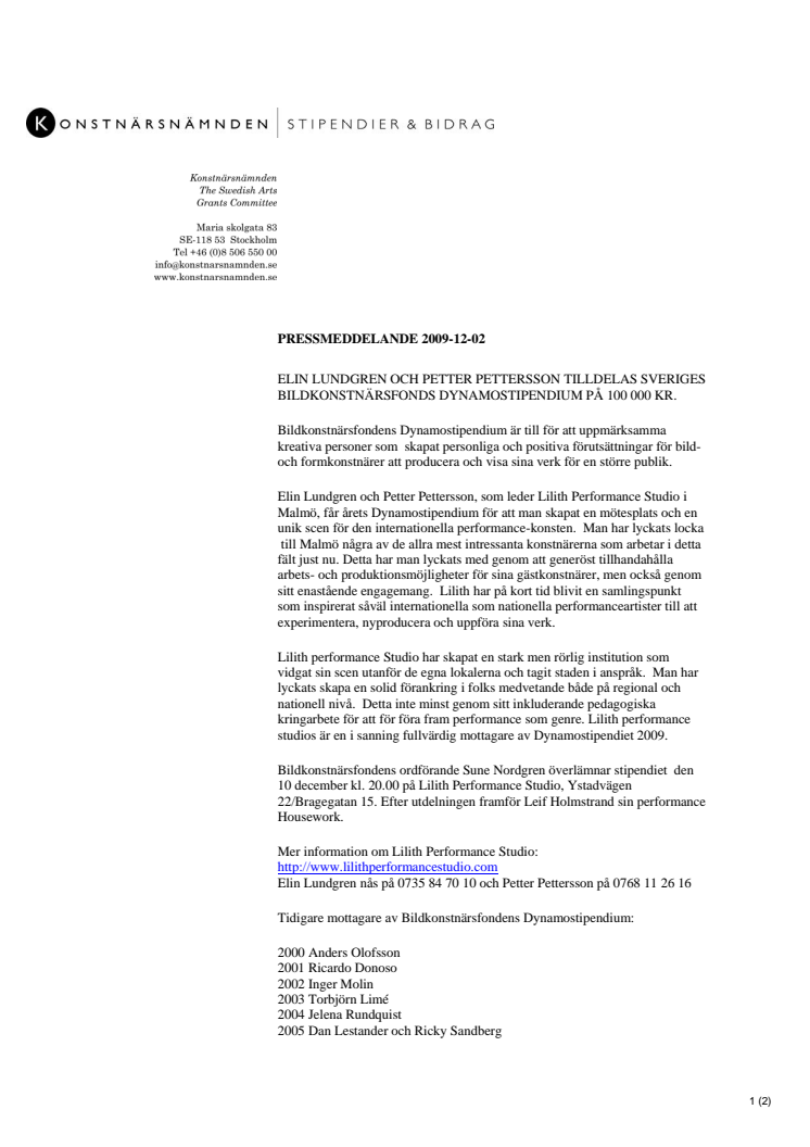 Elin Lundgren och Petter Pettersson på Lilith Performace Studio tilldelas Sveriges bildkonstnärsfonds Dynamostipendium på 100 000 kr.