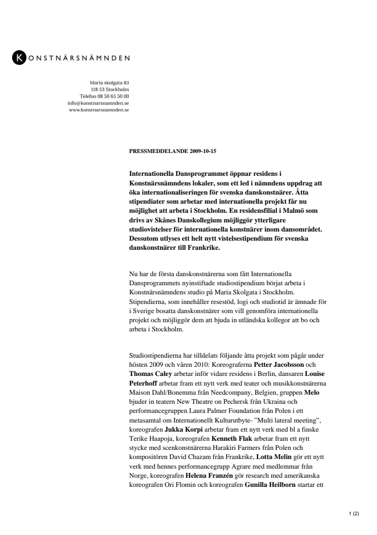 Internationella Dansprogrammet öppnar residens i Konstnärsnämndens lokaler, som ett led i nämndens uppdrag att öka internationaliseringen för svenska danskonstnärer. En residensfilial i Malmö möjliggör ytterligare studiovistelser för internationella konstnärer inom dansområdet. Dessutom utlyses ett helt nytt vistelsestipendium för svenska danskonstnärer till Frankrike.