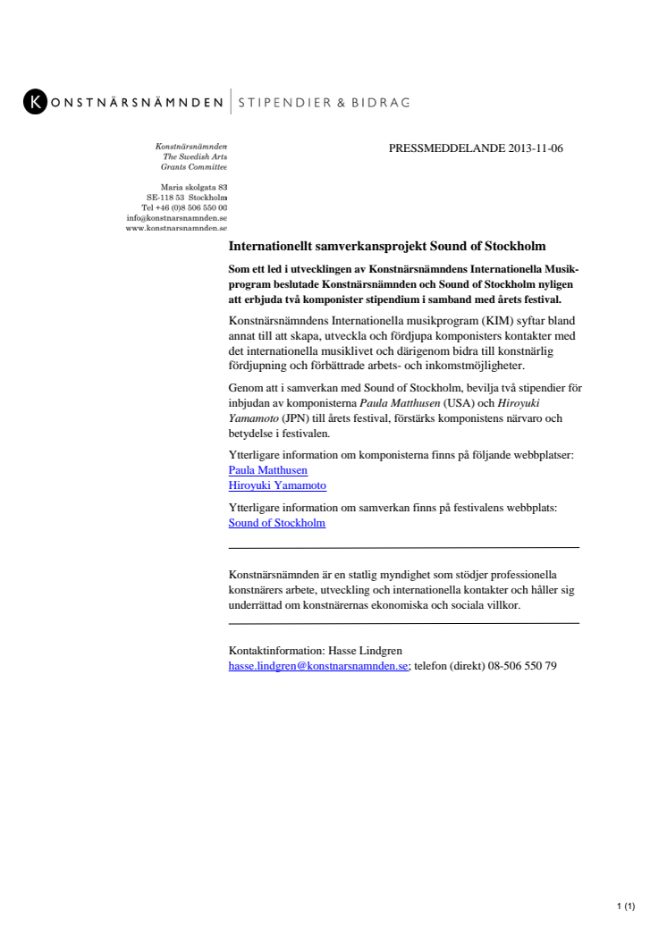Genom att i samverkan med Sound of Stockholm, bevilja två stipendier för inbjudan av komponisterna Paula Matthusen (USA) och Hiroyuki Yamamoto (JPN) till årets festival, förstärks komponistens närvaro och betydelse i festivalen.