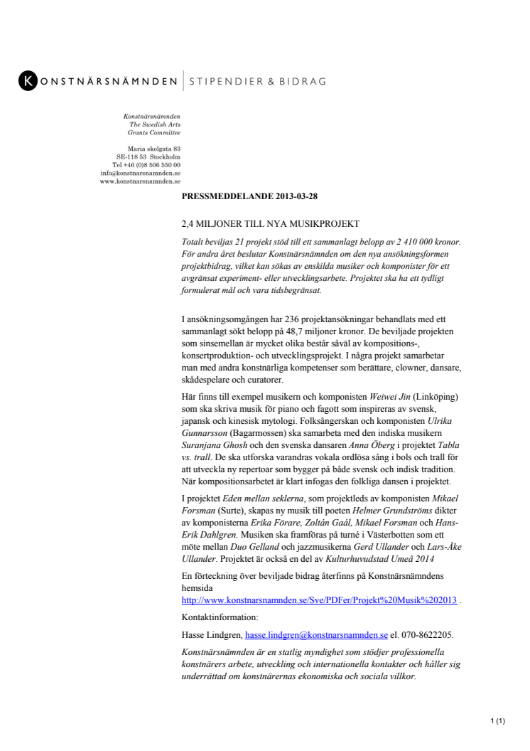Totalt beviljas 21 projekt stöd till ett sammanlagt belopp av 2 410 000 kronor. För andra året beslutar Konstnärsnämnden om den nya ansökningsformen projektbidrag, vilket kan sökas av enskilda musiker och komponister för ett avgränsat experiment- eller utvecklingsarbete. Projektet ska ha ett tydligt formulerat mål och vara tidsbegränsat.