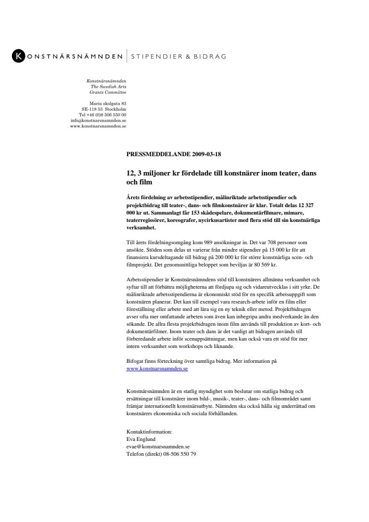 Årets fördelning av arbetsstipendier, målinriktade arbetsstipendier och projektbidrag till teater-, dans- och filmkonstnärer är klar. Totalt delas 12 327 000 kr ut. Sammanlagt får 153 skådespelare, dokumentärfilmare, mimare, teaterregissörer, koreografer, nycirkusartister med flera stöd till sin konstnärliga verksamhet.