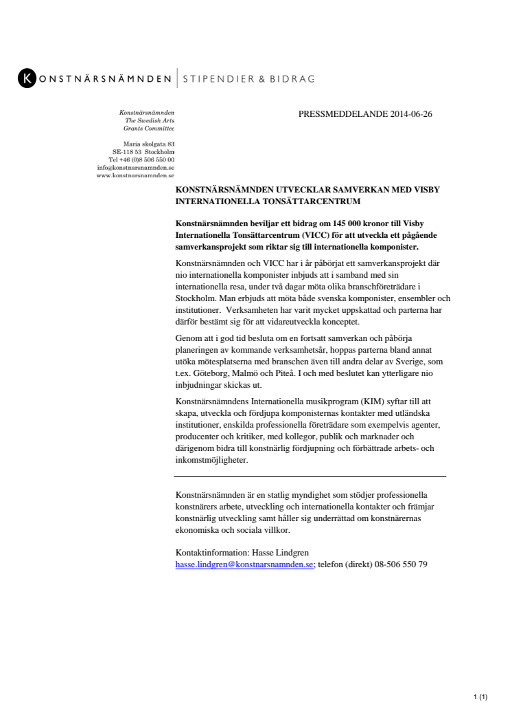 Konstnärsnämnden beviljar ett bidrag om 145 000 kronor till Visby Internationella Tonsättarcentrum (VICC) för att utveckla ett samverkansprojekt som riktar sig till internationella komponister.